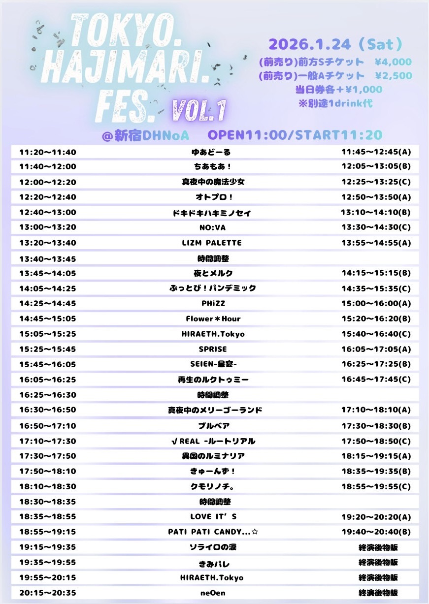 √REAL ールートリアルー / HIRAETH.Tokyo / ちあもあ! / オトプロ! / ゆあどーる / 再生のルクトゥミー / ぶっとび!パンデミック / きゅーんず! / ドキドキハキミノセイ / LOVE IT’S / 真夜中の魔法少女 / NO:VA / 夜とメルク / 真夜中のメリーゴーランド / SEIEN-星宴- / LIZM PALETTE / Flower*Hour / クモリノチ。 / PHiZZ / 異国のルミナリア / PATI PATI CANDY...☆ / ブルベア / ソライロの涙 / neOen / SPRISE / きみパレ