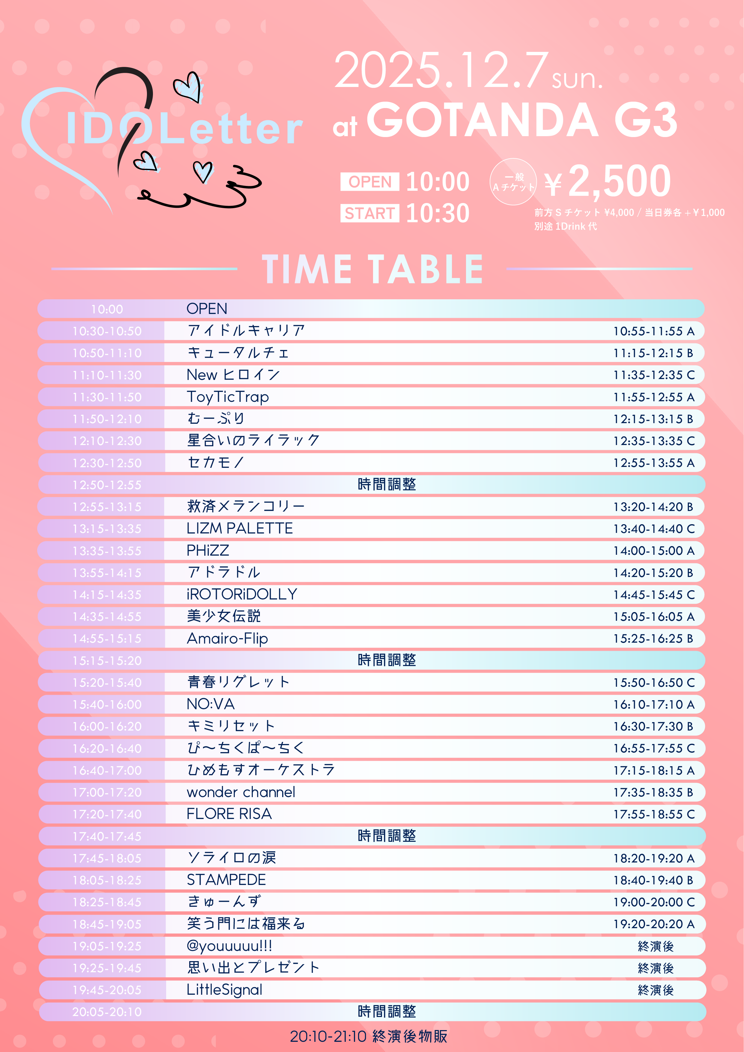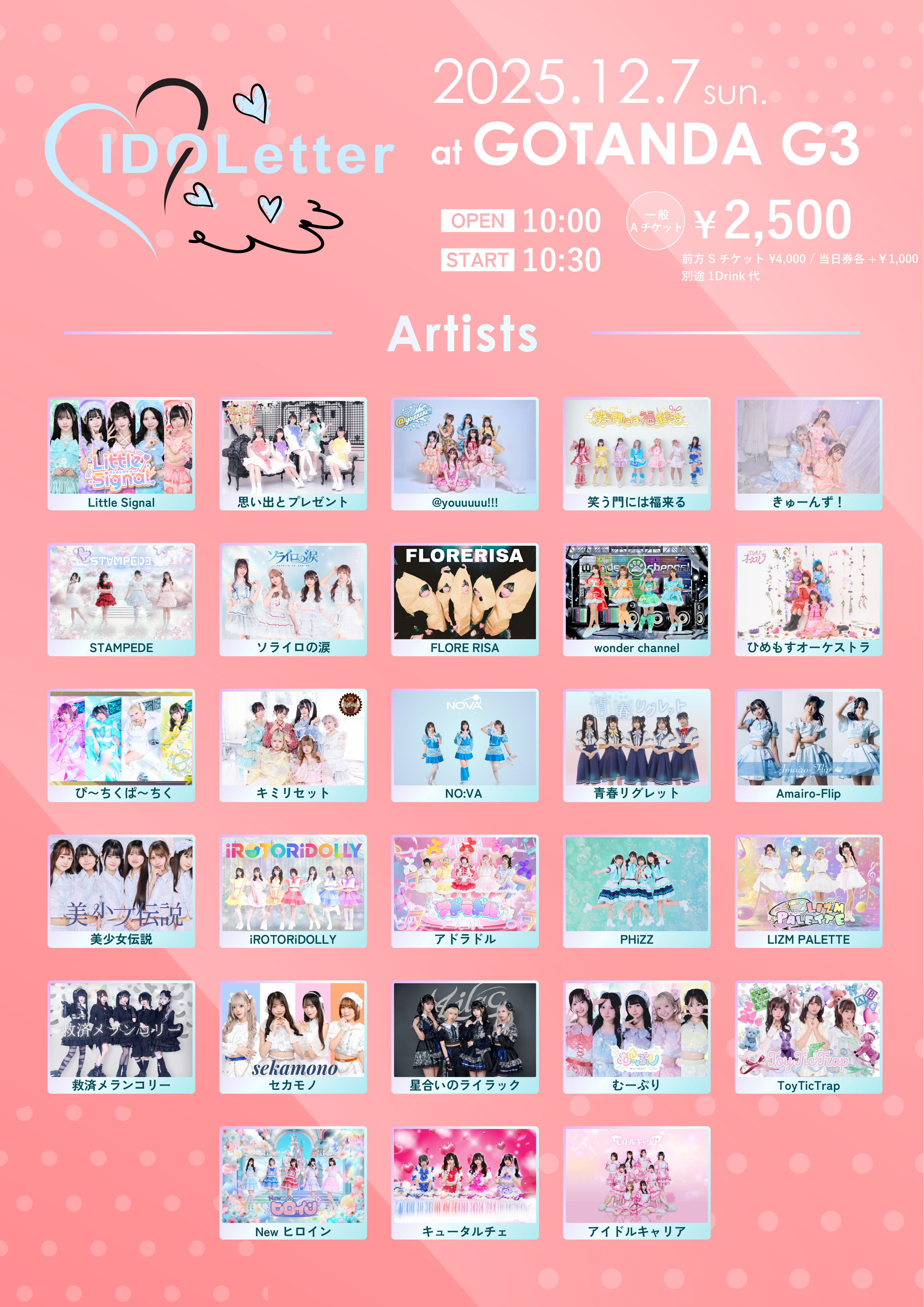 アドラドル / 思い出とプレゼント / PHiZZ / iROTORiDOLLY / @youuuuu!!! / 星合いのライラック / 青春リグレット / セカモノ / きゅーんず! / ぴ〜ちくぱ〜ちく / ソライロの涙 / LIZM PALETTE / ひめもすオーケストラ / 救済メランコリー / STAMPEDE / Amairo-Flip / wonder channel / キミリセット / 美少女伝説 / Newヒロイン / LittleSignal / NO:VA / ToyTicTrap / FLORE RISA / キュータルチェ / 笑う門には福来る / むーぷり / アイドルキャリア