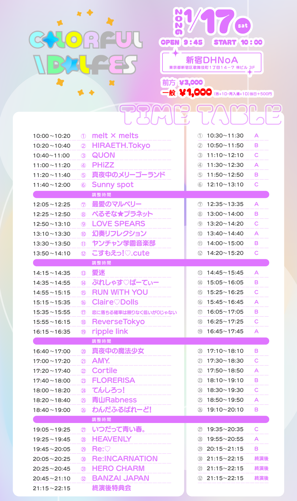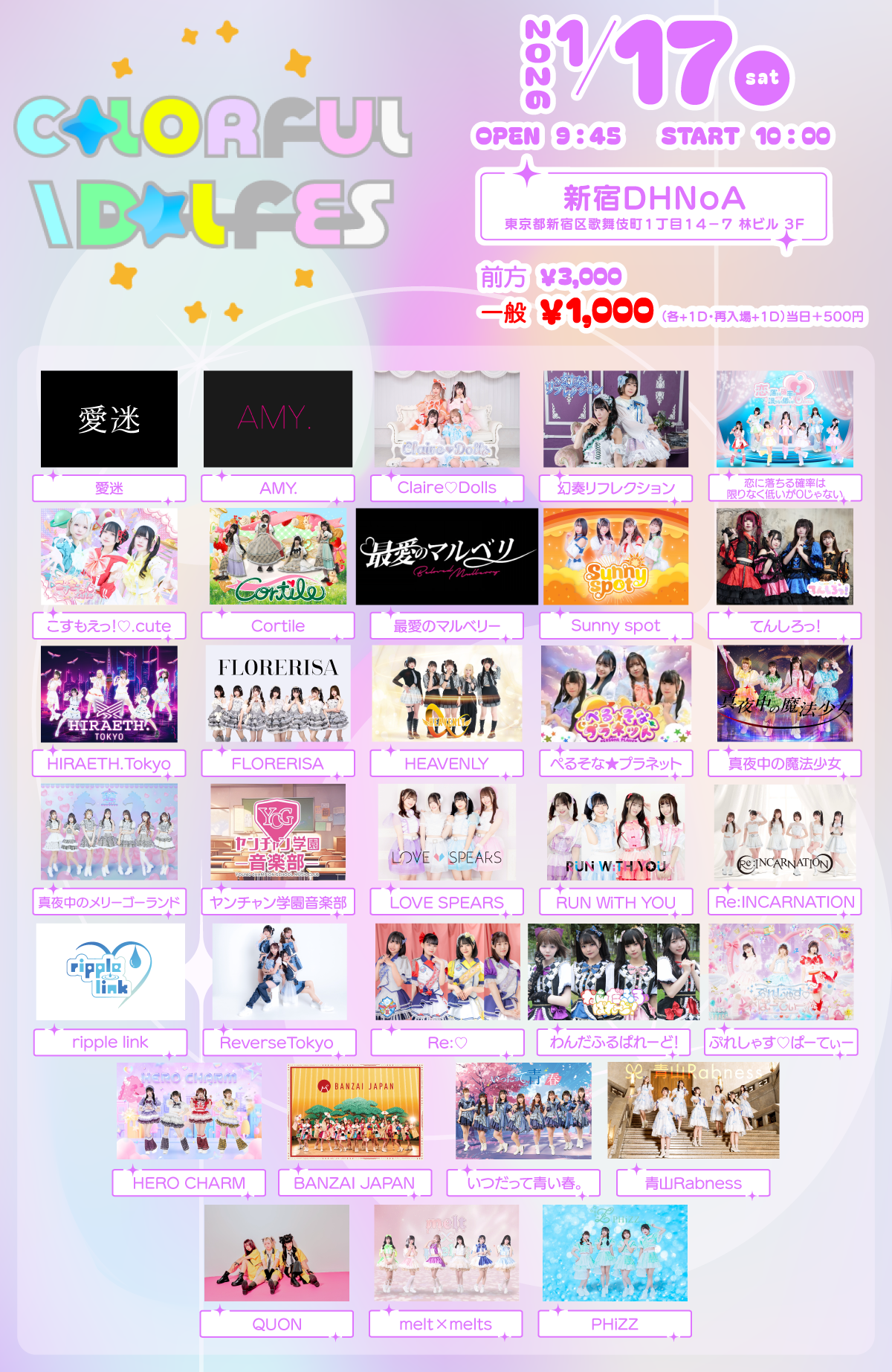 愛迷 / AMY. / Claire♡Dolls / 幻奏リフレクション / 恋に落ちる確率は限りなく低いが0じゃない / こすもえっ!♡.cute / Cortile / 最愛のマルベリー / Sunny spot / てんしろっ! / HIRAETH.Tokyo / HERO CHARM / FLORERISA / HEAVENLY / ぷれしゃす♡ぱーてぃー / ぺるそな✯プラネット / 真夜中の魔法少女 / 真夜中のメリーゴーランド / ヤンチャン学園音楽部 / LOVE SPEARS / RUN WiTH YOU / Re:INCARNATION / ripple link / ReverseTokyo / Re:♡ / わんだふるぱれーど! / BANZAI JAPAN / いつだって青い春。 / 青山Rabness / QUON / melt × melts / PHiZZ