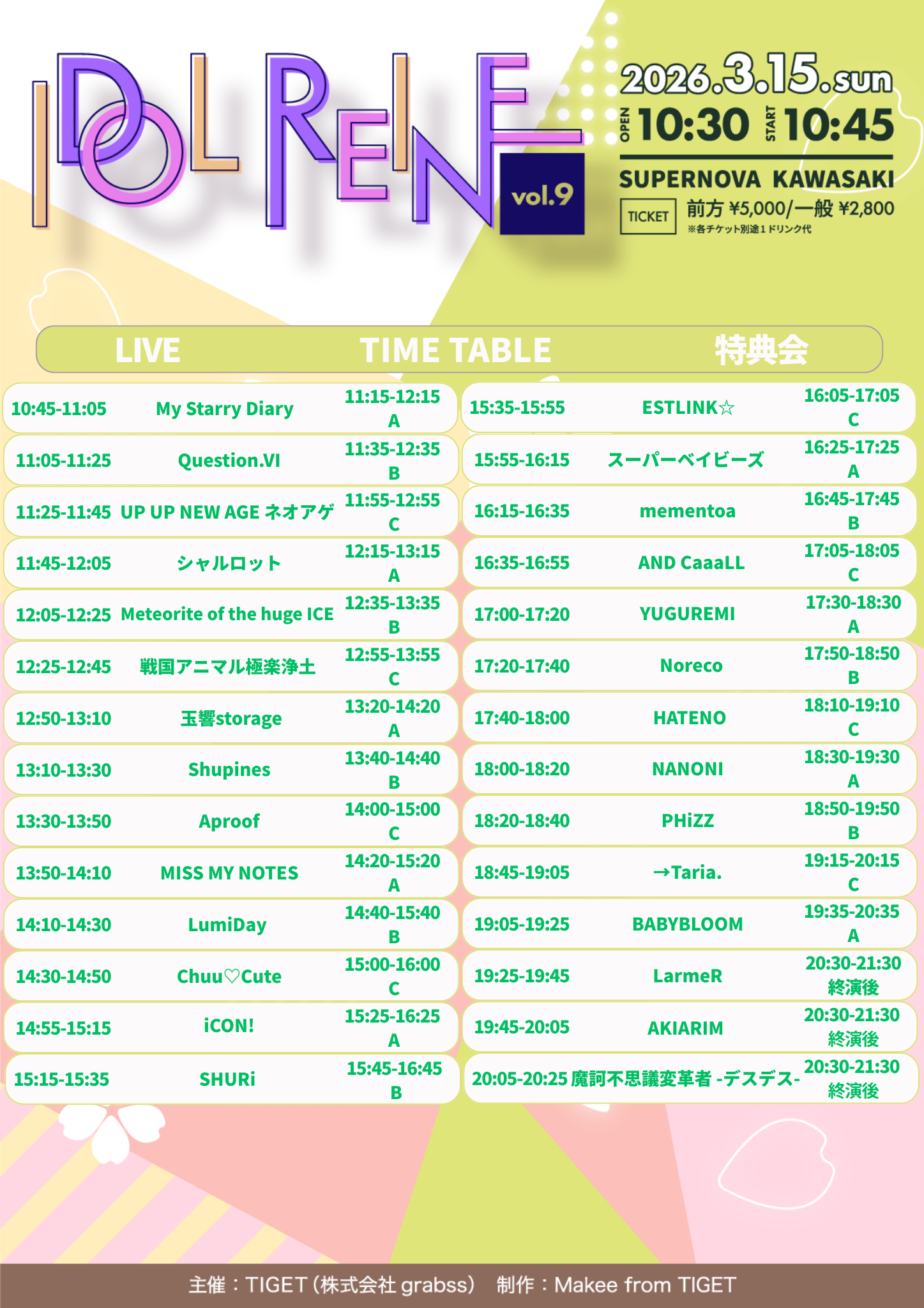 iCON! / AKIARIM / UP UP NEW AGE ネオアゲ / Aproof / AND CaaaLL / ESTLINK☆ / Question. VI / シャルロット / Shupines / SHURi / スーパーベイビーズ / 戦国アニマル極楽浄土 / 玉響storage / Chuu♡Cute / NANONI/ → Taria. / Noreco / HATENO / PHiZZ / BABYBLOOM / My Starry Diary / 魔訶不思議変革者 -デスデス-/ MISS MY NOTES / Meteorite of the huge ICE / mementoa / YUGUREMI / LarmeR